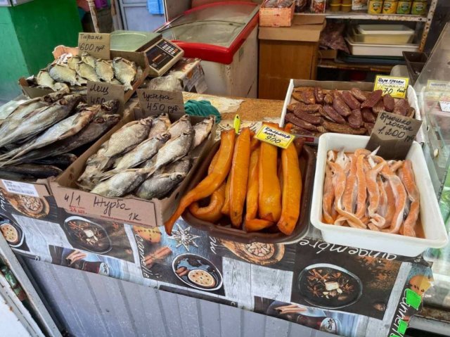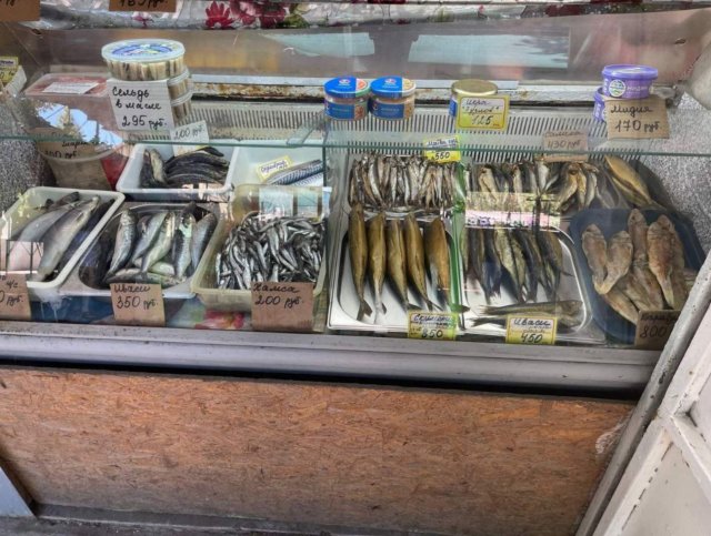 З імпровізованих прилавків на проході біля рибних рядів, як це було донедавна, нові власники торгувати не дозволяють.Трішки про ціни на рибу. Кефаль коштує 250 руб/кг. Піленгас - так само, хоча є за 200. Дві сотні коштує і кіло бичків, яких моментально розбирають покупці. Камбала вартує 150 - 200, калкан - 300 - 400 руб/кг.