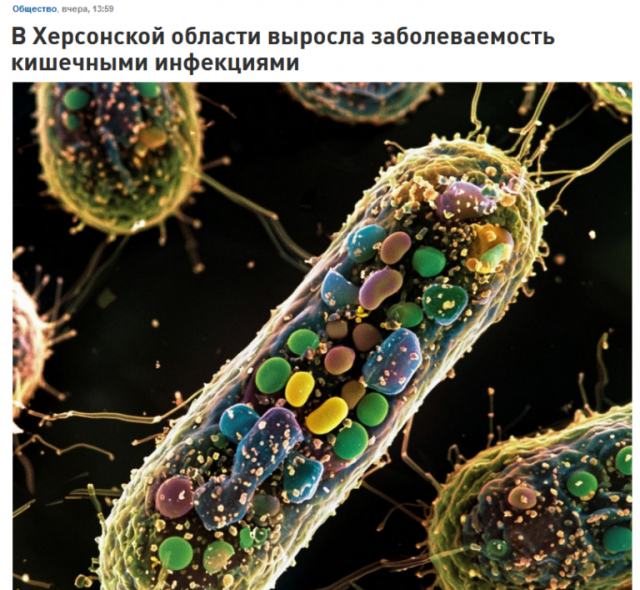 “Роспотребнадзор Херсонської області повідомив про поширення гострих кишкових інфекцій. У регіоні зафіксовано зростання цього типу хвороб. За 2025 рік відмічено 163 випадки захворювань. За даними відомства, показник захворюваності на 14,7 відсотка перевищив рівень минулого року. Проте кількість випадків залишається в межах середньобагаторічних значень для регіону. Усі випадки захворювань проходять обов’язкове лабораторне обстеження”, – зазначило те ж саме проросійське видання вже 11 серпня цього року.Росіяни заспокоюють місцеве населення тим, що серед 163 хворих кишковими інфекціями поки що не зустрічалось жодного випадку холери.