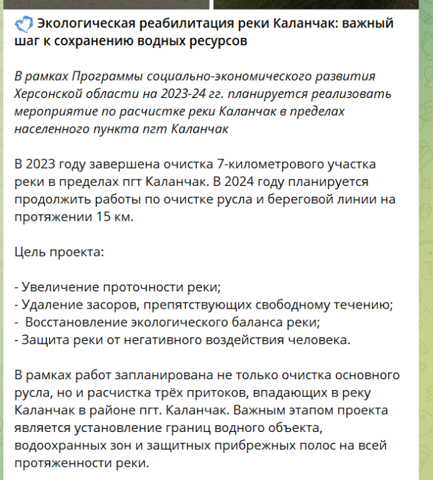 В рамках робіт росіяни планують не лише очищення основного русла, а й розчищення трьох приток, що впадають у річку Каланчак у районі селища Каланчак. Важливим етапом проекту є встановлення меж водного об'єкта, водоохоронних зон та захисних прибережних смуг на всій довжині річки, пишуть в окупаційних медіа і додають: реалізація цього проекту є важливим кроком до збереження водних ресурсів Херсонської області, забезпечуючи збалансований та сталий розвиток регіону. Що вкладають у цю фразу, невідомо.