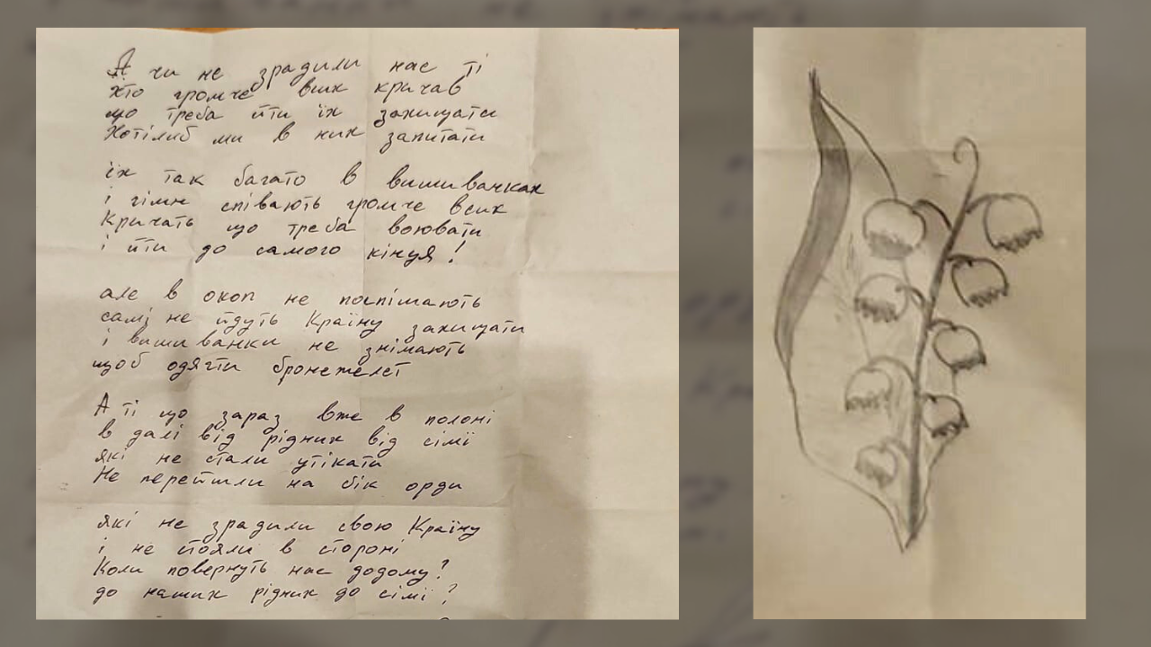 Вірш Дениса Ляльки, переданий з ув’язнення в РФ. На цьому ж аркуші бранець намалював квіткуНині Юлія на прохання Дениса звертається до українських державних органів і закликає посприяти якнайшвидшому визволенню брата.