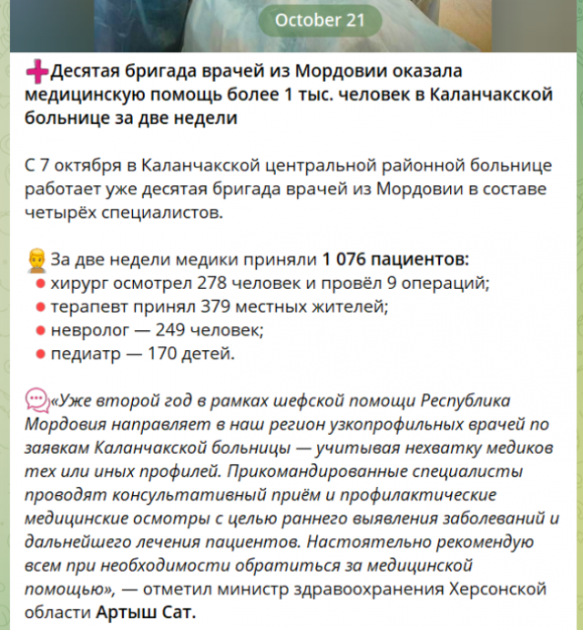 Росіяни продовжують лікування людей в окупованих територіях «вахтовим методом»: коли у відрядження прибувають лікарі з Росії та по два — три тижні працюють у різних громадах Херсонщини. Черговою громадою став Каланчак.Так, російські лікарі за два тижні нібито обслужили 1000 осіб у Каланчацькому районі. Приймали всього чотири лікаря: хірург, терапевт, невролог та педіатр. На прийом до всіх лікарів потрібно записуватись заздалегідь — іноді за кілька місяціяв. І ніхто не знає, коли зможе прийняти хоч якийсь лікар, тому що в місцевих лікарнях лікарів залишилось вкрай мало: переважна більшість виїхали, бо працювати в окупації для деяких неможливо.