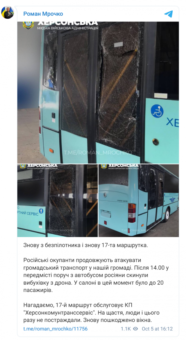 “Знову з безпілотника і знову 17-та маршрутка. Російські окупанти продовжують атакувати громадський транспорт у нашій громаді. Після 14:00 у передмісті поруч з автобусом росіяни скинули вибухівку з дрона. У салоні в цей момент було до 20 пасажирів”, - зазначається у повідомленні.