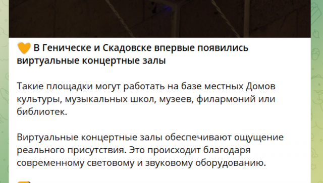 У повідомленнях окупаційних медіа обмежились скромними новинами про те, що такі віртуальні зали можуть забезпечити ефект присутності на концерті. Йдеться про концертний зал у Скадовську або Генічеську, де на сцені — великий екран, з якого транслюють виступ артиста або оркестру.