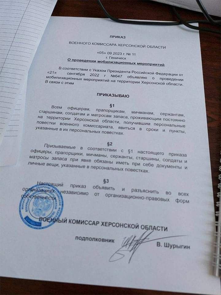 Ніякої прихованої мобілізації – окупанти видали офіційний наказ «про проведення мобілізаційних заходів на території Херсонської області».У соцмережах шириться наказ окупаційного «військового комісара Херсонської області» Вадима Шуригіна про мобілізацію. Документ підписано 5 вересня 2023 року.