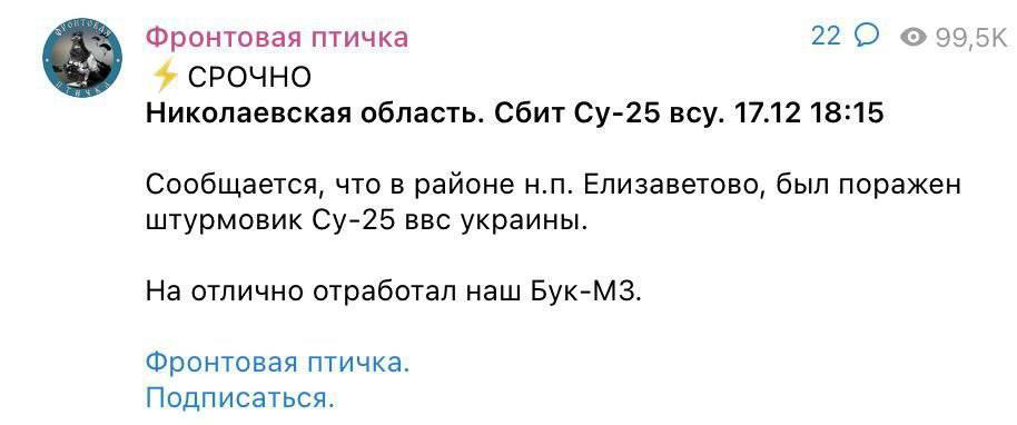 Як пише канал "Фронтовая птичка" з так званого "z-середовища", сьогодні, 17 грудня, о 18:15 літак було збито системою "Бук-М3" над населеним пунктом "Єлизаветово" Миколаївської області. Щоправда, такого села на Миколаївщині немає. Можливо, окупанти мали на меті село Єлизаветівка Снігурівського району. Але там жодного збиття не було.