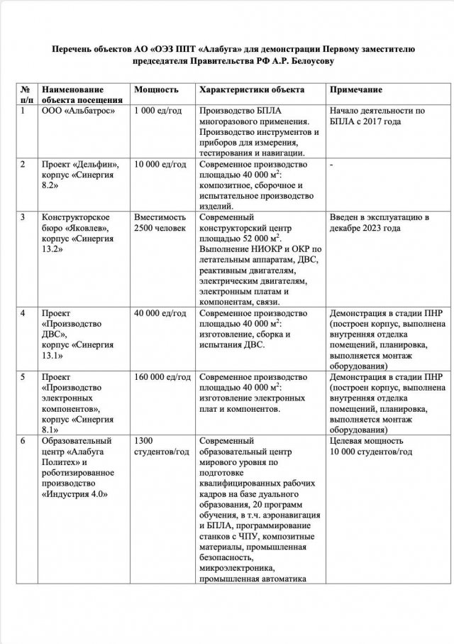 В документі, що передував візиту першого заступника голови уряду рф Андрія Бєлоусова (який за сумісництвом виконує ще й функції голови урядової комісії з питань розвитку безпілотних авіаційних систем) вказано, що планова потужність виробництва дронів “Герань-2” складає 10 тисяч одиниць на 2024 рік. З метою конспірації виробництво шахедів названо “проєктом Дельфін”.