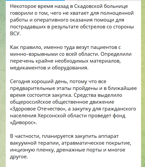 Після обстрілу ринку у Великих Копанях на Херсонщині кількість постраждалих за повідомленнями окупантів — 14 осіб: шестеро загинули та вісім — поранені. Втім, лікувати поранених немає чим.Це зокрема підтвердив і окупаційний «сенатор від Херсонської області» Ігорь Кастюкевич. Росіяни лише зараз визначили перелік необхідних препаратів та обладнання, необхідних для скадовської лікарні. До цього там це обладнання росіяни переважно вивезли, адже до окупації воно було. Препаратів систематично не вистачало — не вистачає і нині. Також у першу чергу росіяни лікують своїх військових, а не місцеве населення.