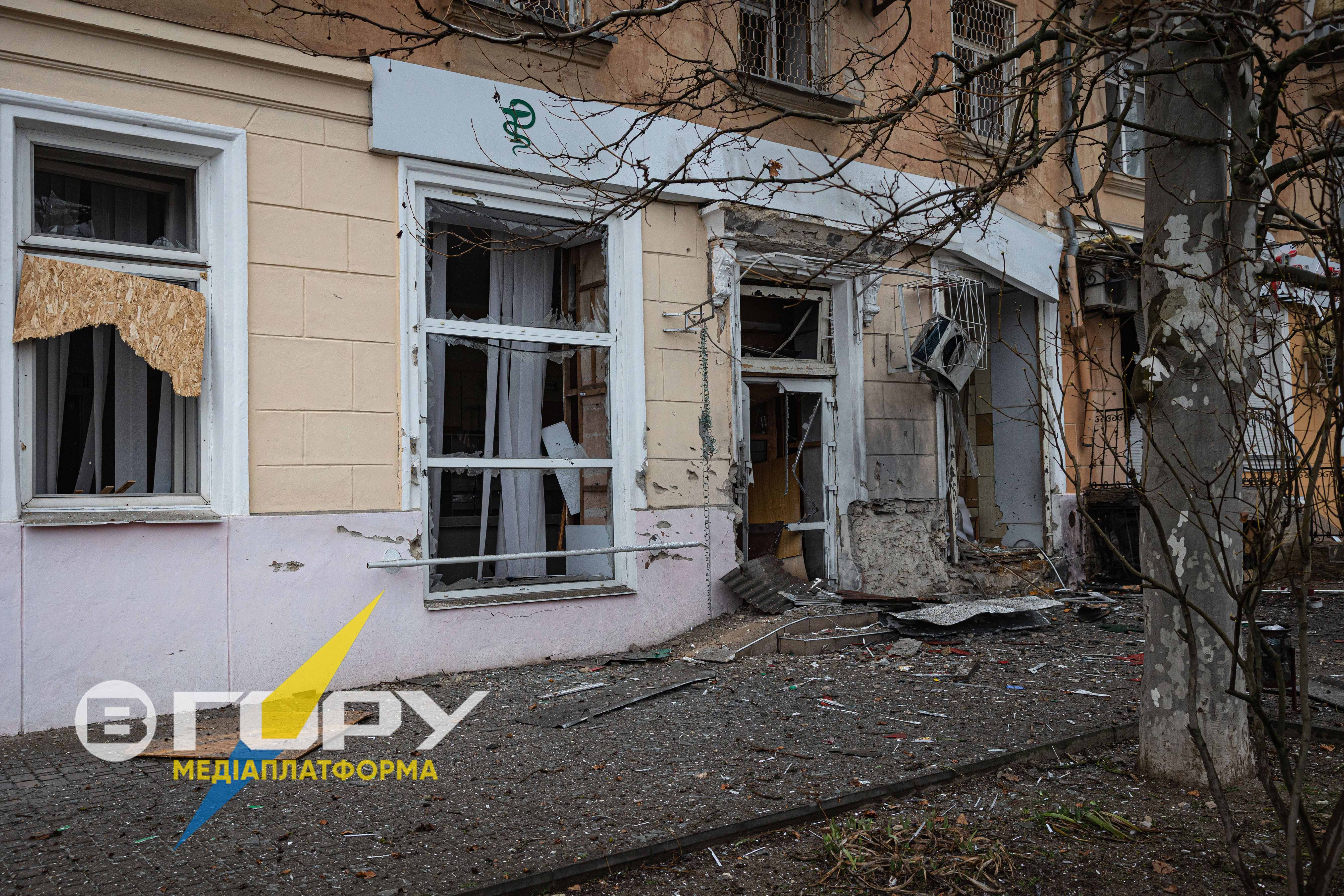 Під російський обстріл потрапила аптека в Херсоні.Фотокореспондент Медіаплатформи “Вгору” Олександр Корняков зробив світлини пошкодженого приміщення.