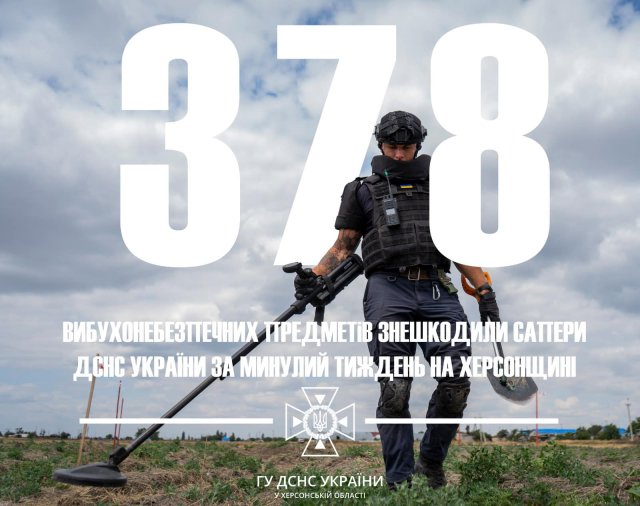 Протягом минулого тижня сапери ДСНС України знешкодили 378 вибухонебезпечних предметів на територіях, де велись активні бойові дії.