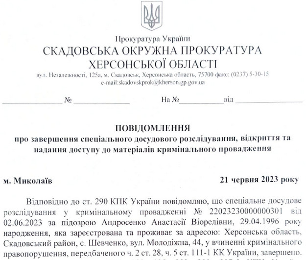 Її діяльність призвела до проголошення Росією спроби анексії Херсонщини. За це Анастасії Андросенко загрожує кримінальна відповідальність.
