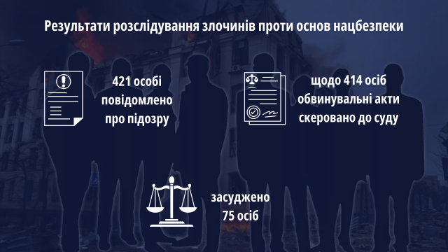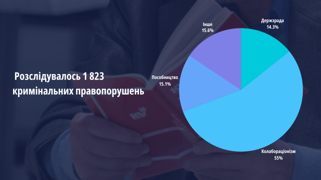 Серед них: 260 за фактом державної зради (ст. 111 КК України), 1002 - колабораційної діяльності (ст. 111-1 КК України), 275 - щодо пособників державі-агресору (ст. 111-2 КК України) тощо.За результатами розслідування повідомлено про підозру 421 особі, щодо 414 зловмисників обвинувальні акти спрямовано до суду.