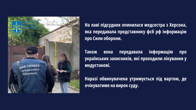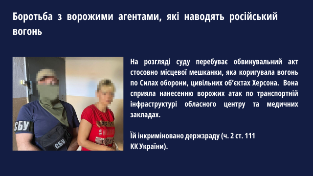 Статус обвинуваченої за вчинення держзради отримала медсестра однієї з лікарень міста Херсон (ч. 2 ст. 111 КК України). Після звільнення від окупантів обласного центру жінка продовжила підтримувати контакт з представником фсб рф, якому передавала дані українських захисників, що лікувалися в медичній установі, а також відомості про дислокацію, озброєння та переміщення військової техніки підрозділів ЗСУ та інших сил оборони.На розгляді суду перебуває обвинувальний акт стосовно місцевої мешканки, яка коригувала вогонь по Силах оборони, цивільних об’єктах Херсона. Вона сприяла нанесенню ворожих атак по транспортній інфраструктурі обласного центру та медичних закладах. Їй інкриміновано держзраду (ч. 2 ст. 111 КК України).