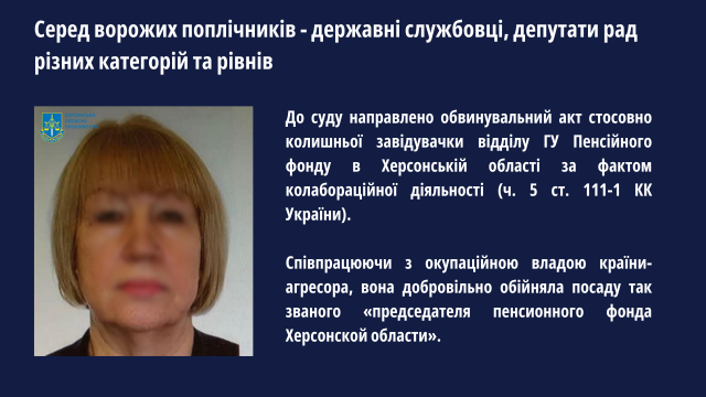 Серед ворожих поплічників виявляються державні службовці, депутати рад різних категорій та рівнів.За результатом досудового розслідування до суду направлено обвинувальний акт стосовно колишньої завідувачки відділу ГУ Пенсійного фонду в Херсонській області за фактом колабораційної діяльності (ч. 5 ст. 111-1 КК України). Співпрацюючи з окупаційною владою країни-агресора, вона добровільно обійняла посаду так званого «председателя пенсионного фонда Херсонской области».
