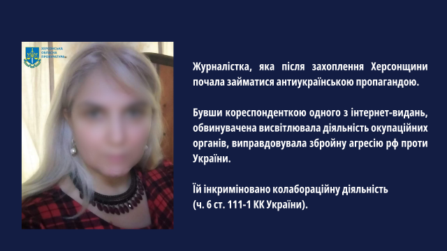 Також скеровано до суду обвинувальний акт стосовно місцевої журналістки, яка після захоплення Херсонщини почала займатися антиукраїнською пропагандою. Бувши кореспонденткою одного з інтернет-видань, обвинувачена висвітлювала діяльність окупаційних органів, виправдовувала збройну агресію рф проти України. Її дії кваліфіковано, як колабораційна діяльність (ч. 6 ст. 111-1 КК України).Завершено досудове розслідування стосовно жительки Нової Каховки за фактом колабораційної діяльності, виготовленні та поширенні у медіа матеріалів, які виправдовують окупацію української території (ч. 5 ст. 111-1, ч. 3 ст. 436-2 КК України). Вона створювала відеоматеріали, в яких пропагувала ворожий режим, працюючи журналісткою підконтрольної окупантам ТРК «таврия».