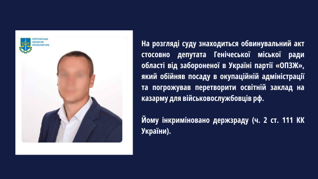 На розгляді суду знаходиться обвинувальний акт стосовно депутата Генічеської міської ради області від забороненої в Україні партії «ОПЗЖ», який обійняв посаду в окупаційній адміністрації та погрожував перетворити освітній заклад на казарму для військовослужбовців рф. Йому інкриміновано держзраду (ч. 2 ст. 111 КК України).Сфокусовано роботу на виявлені осіб, які стали вести інформаційну діяльність у співпраці з державою-агресоркою.