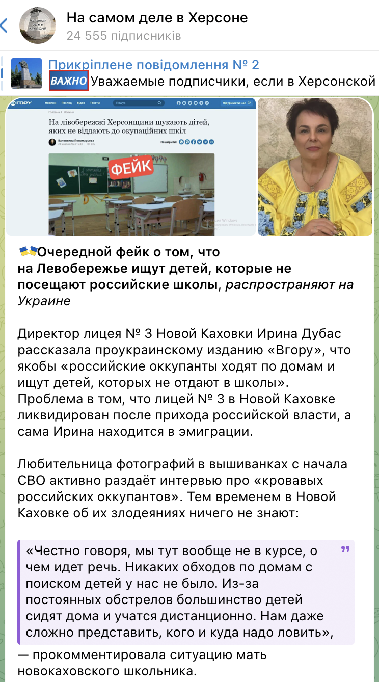 По-перше, в цьому тексті бачимо застосування логічного прийому під назвою “опудало”, або простіше – підміна тези: коли замість основної тези спростовується зовсім інша. Так, окупаційний анонімний канал стверджує: це все фейк, бо директорка ліцею №3 Ірина Дубас виїхала, а росіяни – звичайно – цей ліцей ліквідували. Але ліцей №3 в новині не згадувався. Події, про які йшла мова, стосуються ліцею №10.