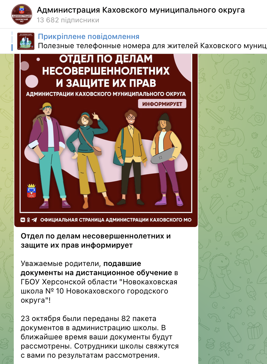 По-третє, Ірина казала, що “батьки, бабусі, дідусі записують дітей в школу. В тій школі головне – здати документи”. Наскільки окупантам важливо зібрати ці папери, можемо бачити з публікацій кожні два дні одного й того ж повідомлення: