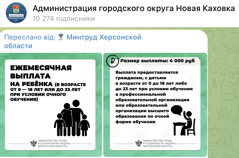 По-друге, в інтерв’ю Ірина говорила, що “...платять кошти щомісяця за це, плюс дають пакет з продуктами. Таким чином, я вважаю, просто наше населення виживає». Російське вторгнення поставило жителів Нової Каховки в умови, коли потрібно виживати. Цим скористалися окупанти: вони запровадили щомісячні грошові виплати в рублях за дітей, яких записали в окупаційні школи.