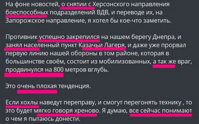 Русняві блогери ниють про втрату села Козачі Лагері на лівому березі Дніпра.Зокрема, вони повідомля.ть, що нібито украинські війскові прорвали першу лінію захисту окупаційних війьск и просунулися далі на 800 метрів.
