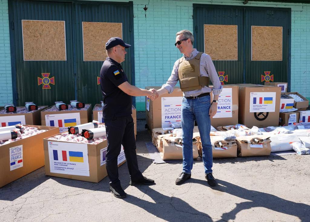 Від Міністерства Європи та зовнішніх справ Французької Республіки, Центру кризових ситуацій та підтримки у супроводі посольства Французької Республіки в Україні рятувальники Херсонського гарнізону отримали гнучкі баки, фільтри та таблетки для очищення питної води.