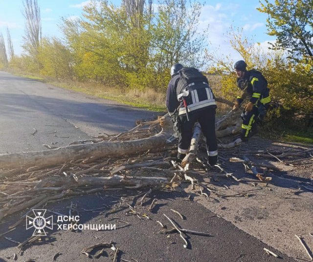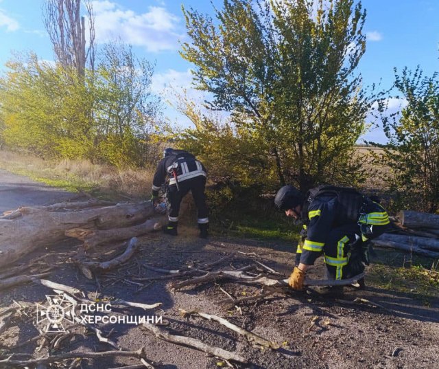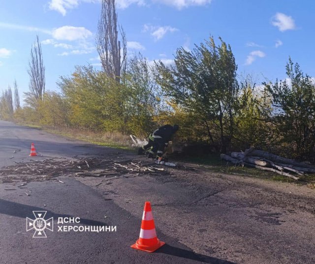 4 листопада до Служби порятунку «101» надійшло повідомлення про те, що на трасі, біля села Ольгине Бериславського району, впало дерево, яке перегородило проїжджу частину дороги та створило загрозу виникнення ДТП.Про це повідомила пресслужба ДСНС Херсонської області.