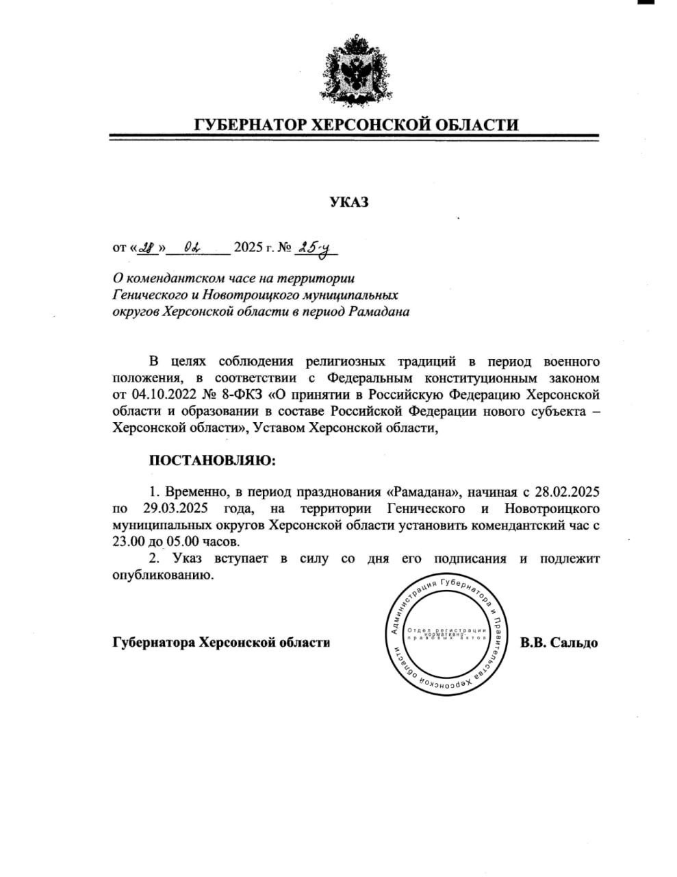 Релігія у Росії і на окупованих територіях давно стала інструментом стримування невдоволених. І окупанти вміло цей інструмент використовують. Аби показати, як він «поважає» почуття віруючих, наприклад, окупаційний губернатор Володимир Сальдо в останній день зими видав «указ» «Про комендантський час на території Генічеського і Новотроїцького муніципальних округів Херсонської області у період Рамадана». Вибір «округів» цілком зрозумілий: по-перше, там є мусульманські громади, а, по-друге, вони далеко від лінії фронту. Тому Сальдо «великодушно» дозволив їх жителям перебувати на вулиці з 5.00 до 23.00. Тобто, на годину більше – раніше комендантська година починалась о 22.00. «Указ» діятиме до 29 березня.