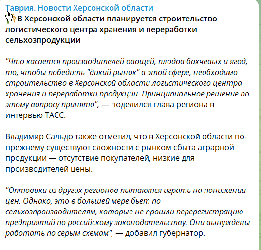 "Що стосується виробників овочів, плодів баштанних та ягід, то щоб перемогти "дикий ринок" у цій сфері, необхідне будівництво в Херсонській області логістичного центру зберігання та переробки продукції. Принципове рішення з цього питання прийнято", - повідомляє проросійське ЗМІ.