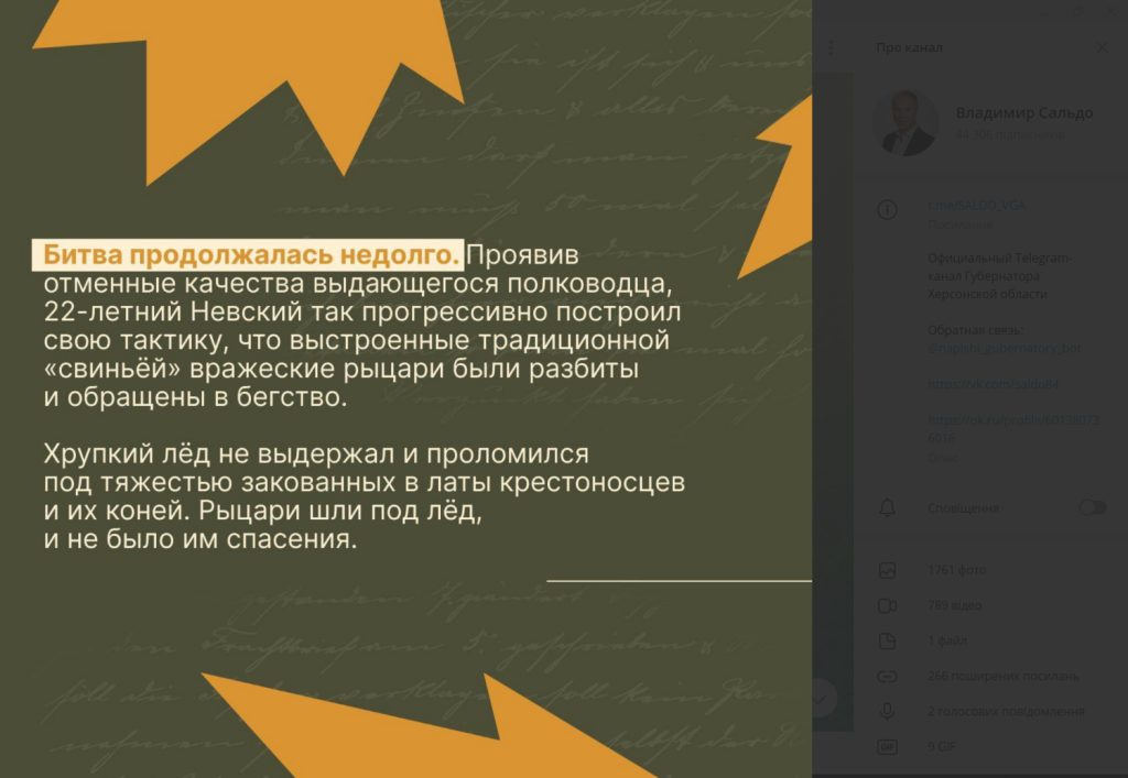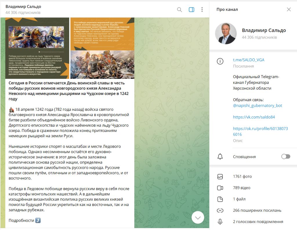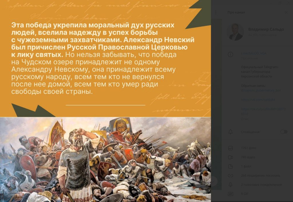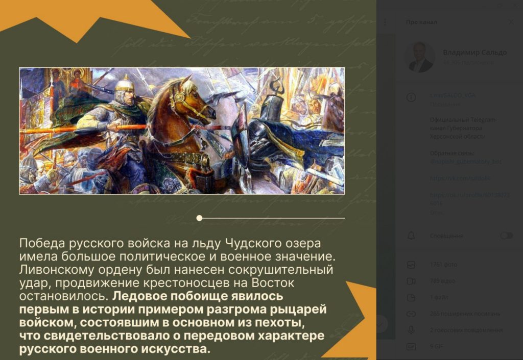 В Telegram-каналі окупаційного губернатора Херсонської області Володимира Сальдо 18 квітня 2024 року розміщене повідомлення з нагоди 782-ї річниці битви на Чудському озері, яку радянська, а потім російська історіографія назвала Льодове побоїще.Сьогодні в Росії відзначається День військової слави на честь перемоги російських воїнів новгородського князя Олександра Невського над німецькими лицарями на Чудському озері 1242 року. 18 квітня 1242 року (782 роки тому) війська святого благовірного князя Олександра Ярославича у кровопролитній битві розбили об’єднане військо Лівонського ордена, Дерптського єпископства та чудських найманців на льоду Чудського озера. Перемога у битві поклала край домаганням німецьких лицарів на землі Русі. Нинішні історики сперечаються про масштаби та місце Льодового побоїща. Проте безперечним залишається його духовно-історичне значення: у цей день було закладено політичну основу російської нації, визначено цивілізаційну самобутність російського народу. Росіяни пішли своїм шляхом, відмінним від західноєвропейського і від східного. Перемога в Льодовому побоїщі повернула росіянам віру у себе після катастрофи монгольських навал. Надалі витончена візантійська політика російських великих князів допомогла майбутній Росії зміцнитися як на східних, так і на західних кордонах, - йдеться в цьому повідомленні.