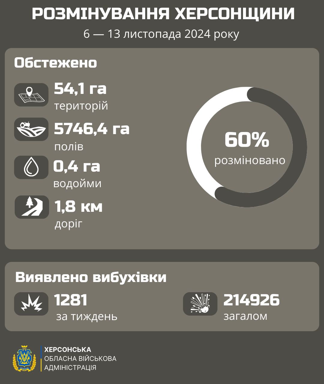 Як повідомляв Укрінформ, на деокупованій Херсонщині станом на 20 серпня 2024 року сапери розмінували 50% території.
