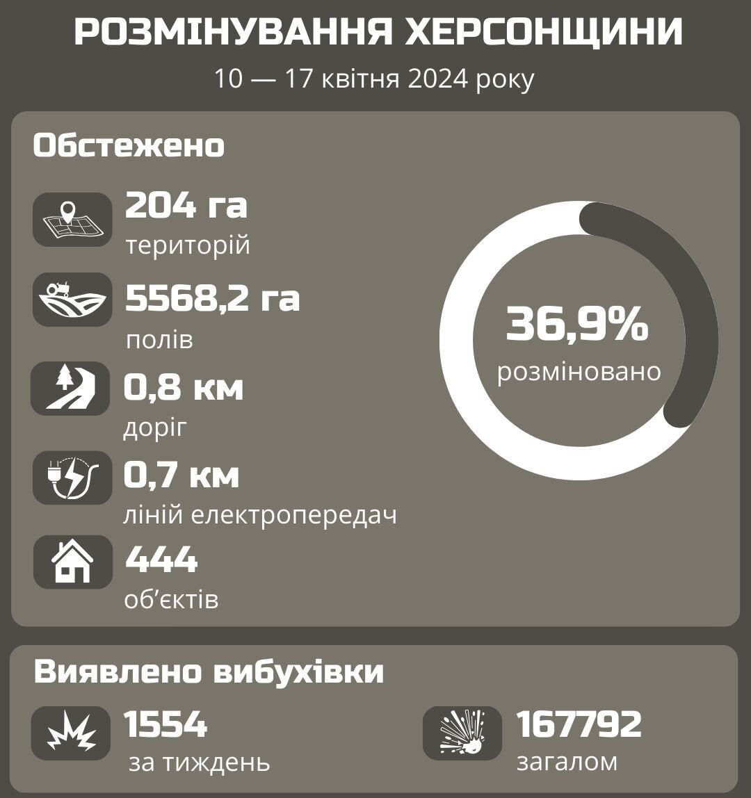 Крім цього, у відомстві зазначили, що над розмінуванням працює понад тисяча саперів.«Фахівців обстежили 204 гектари територій, 5568,2 га полів, 0,8 км доріг, 0,7 км ліній електропередач і ще 444 об’єкти», — показано на інфографіці.