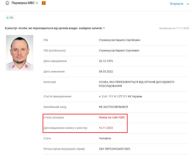 Стремоусова вчора видалили з розшукового реєстру МВС. Мотиви правоохоронців невідомі.