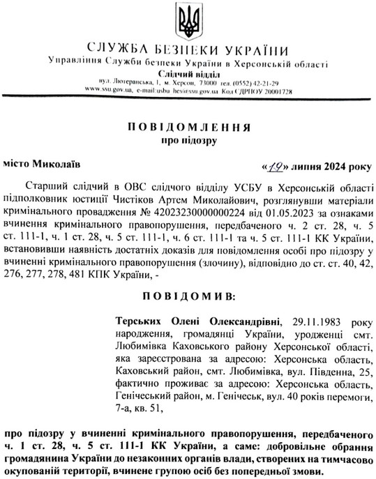 Терських інкримінували колабораціонізм. Вона стала головою окупаційною адміністрації Генічеська в результаті незаконних місцевих виборів 2023 року на ТОТ Херсонської області.
