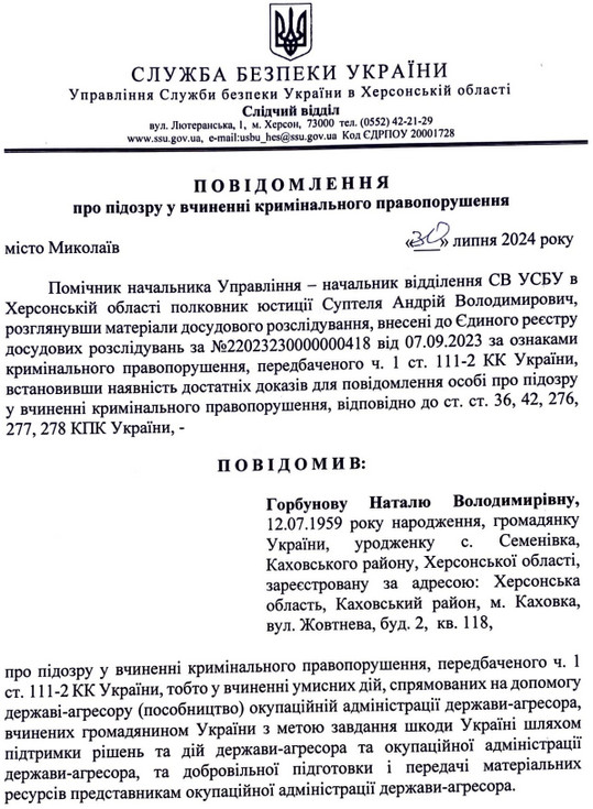 Горбуновій інкримінували пособництво державі-агресору. За інформацією слідства, спершу її призначили заступником директора з управління персоналом. Як стверджує слідство, 26 серпня 2022 року Наталю Горбунову призначили т. в. о. директора водоканалу Херсона.