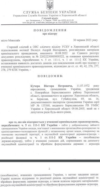 Кучеру інкримінували колабораціонізм та пособництво державі-агресору. Він пішов на співпрацю з росіянами не пізніше 27 липня 2022 року.