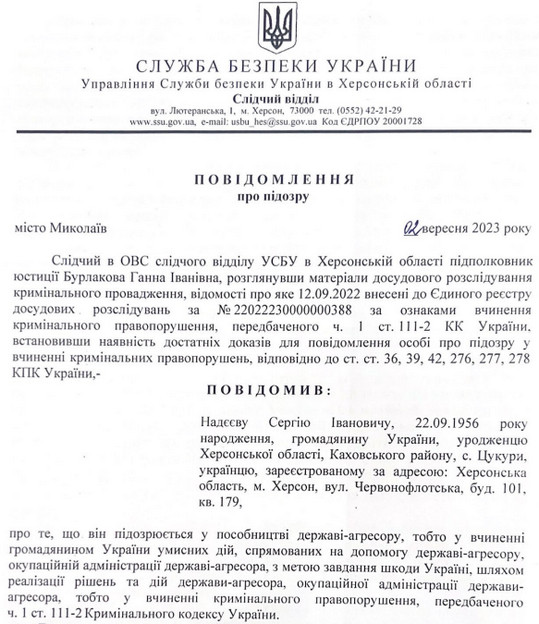 Надєєву інкримінували пособництво державі-агресору. Він пішов на співпрацю з росіянами у червні 2022 року.
