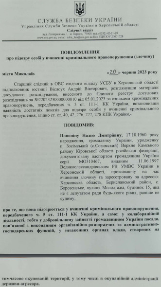 Попоніній інкримінували колабораціонізм. Вона пішла на співпрацю з росіянами не пізніше 2 вересня 2022 року.