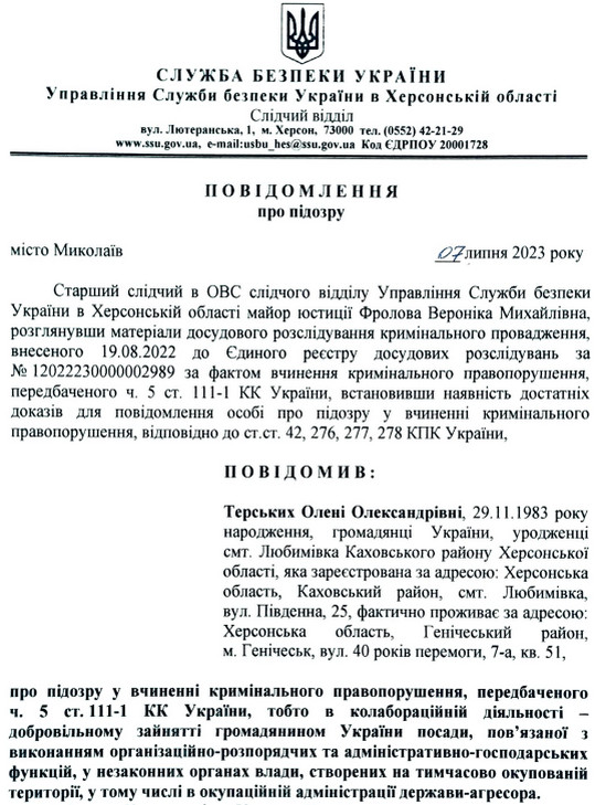 Терських інкримінували колабораціонізм. Вона пішла на співпрацю з росіянами не пізніше серпня 2022 року.