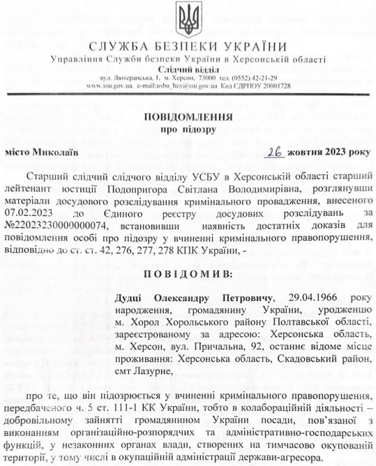 Дудці інкримінували колабораціонізм. Він пішов на співпрацю з росіянами у січні 2023 року.