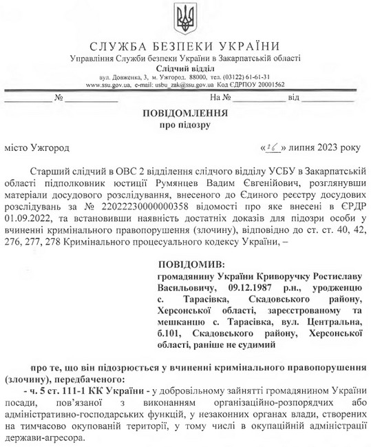 Криворучко інкримінували колабораціонізм. Він пішов на співпрацю з росіянами не пізніше липня 2022 року.