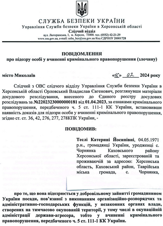 Теслі інкримінували колабораціонізм. За інформацією слідства, вона пішла на співпрацю з росіянами не пізніше початку серпня 2023 року.