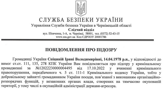 Про це свідчить відповідний документ з сайту Офісу Генерального прокурора і повідомило управління української спецслужби по Чернівецькій області.