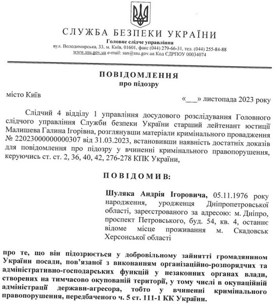 Шуляку інкримінували колабораціонізм. Він пішов на співпрацю з росіянами у лютому 2023 року.