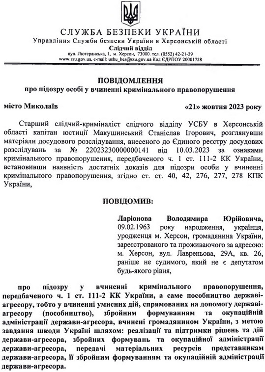 Ларіонову інкримінували пособництво державі-агресору. Він пішов на співпрацю з росіянами не пізніше 8 червня 2022 року.