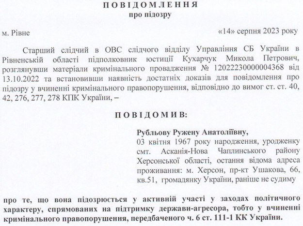 За це Рубльовій заочно загрожує від 10 до 12 років в’язниці (з додатковими обмеженнями та конфіскацією майна або без такої). Триває досудове розслідування.