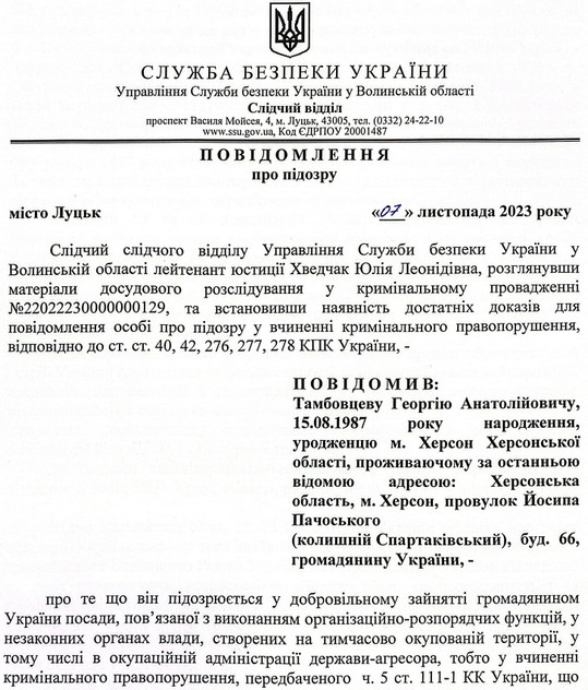 Тамбовцеву інкримінували колабораціонізм. Він отримав посаду в окупаційній адміністрації Херсонської області 1 червня 2022 року.