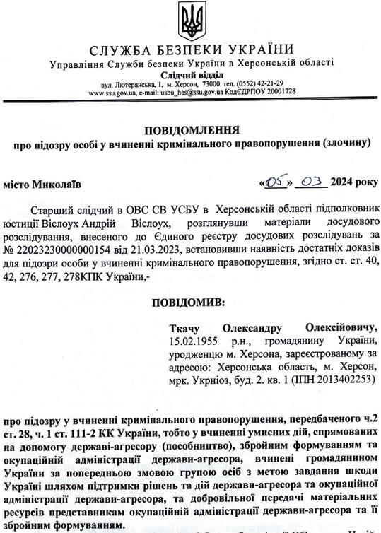 Слідство стверджує, що зареєстрував комунальне підприємство за російськими законами Ткач не пізніше 22 грудня 2022 року.