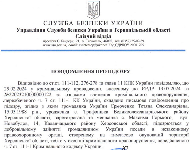 Підозрювану звати Тетяна Єрмоченко. Їй інкримінували колабораціонізм. В повідомленні про підозру не вказують деталі злочину.
