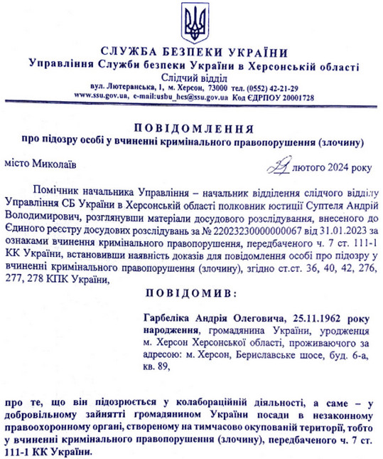 Гарбеліку інкримінували колабораціонізм. За інформацією слідства, він пішов на співпрацю з росіянами 5 вересня 2022 року.
