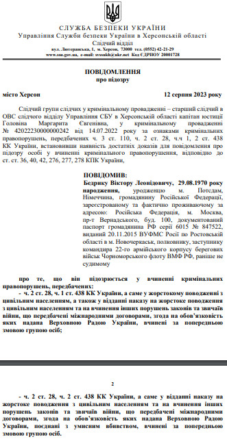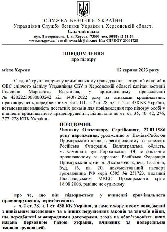 СБУ повідомила про підозру російському “коменданту” Херсонщини
