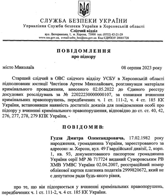 Гудзю інкримінували пособництво державі-агресору та крадіжку. За версією слідства, він встановив контакт з росіянами не пізніше 30 квітня 2022 року.